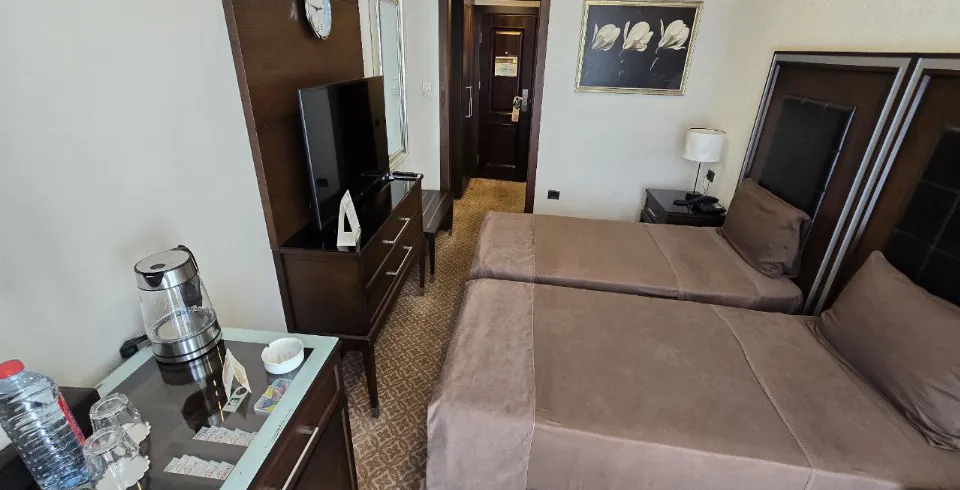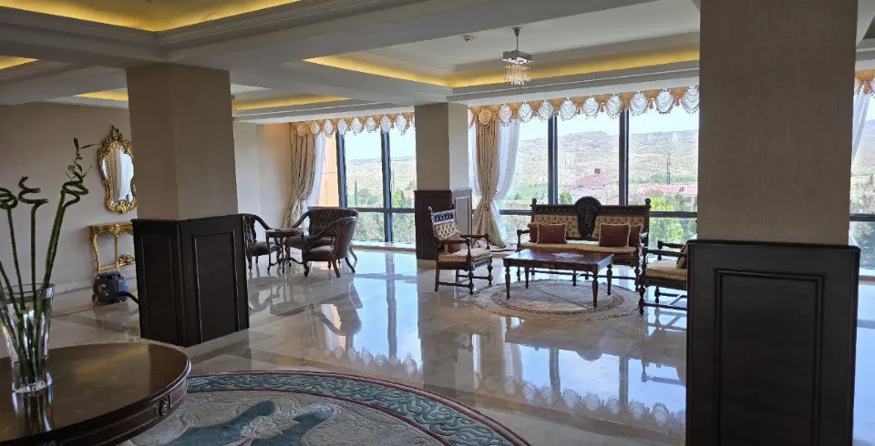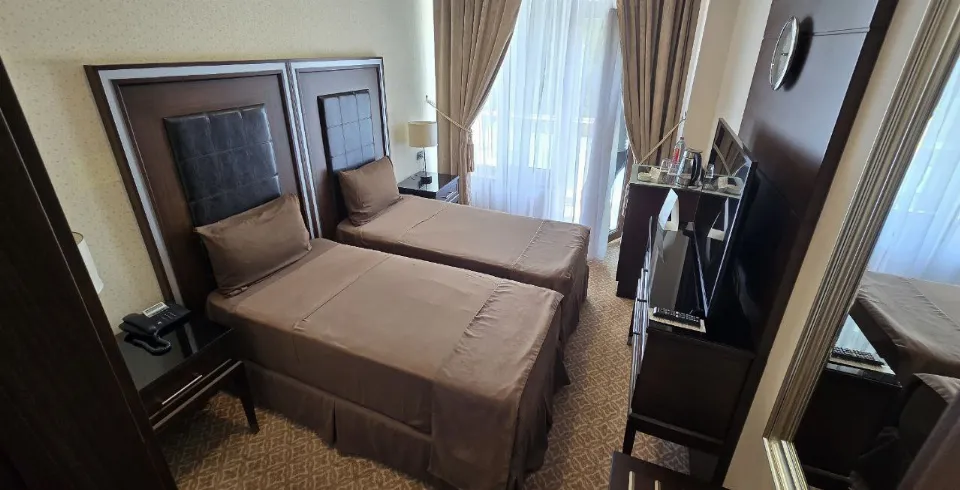 Просторный номер категории Deluxe площадью около 38 м² создан для гостей, ценящих уют и современный стиль. Элегантный интерьер, функциональная мебель и продуманная планировка обеспечивают максимум удобства во время отдыха или деловой поездки в Нафталан.