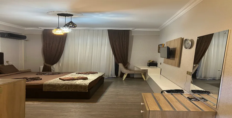 Suite номер в санатории Gold Naftalan — это светлый и элегантный номер площадью 56 м², включающий отдельную спальню и уютную гостиную. Номер прекрасно подходит для размещения до 3 взрослых и 1 ребёнка, обеспечивая комфорт и приватность.