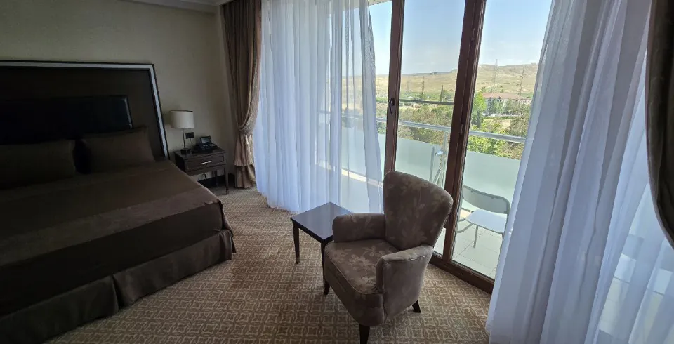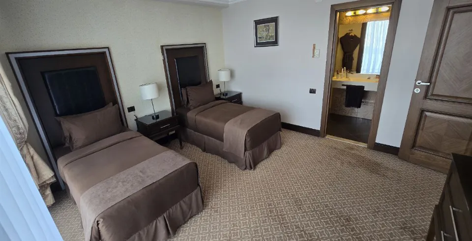 Просторный номер категории Deluxe площадью около 38 м² создан для гостей, ценящих уют и современный стиль. Элегантный интерьер, функциональная мебель и продуманная планировка обеспечивают максимум удобства во время отдыха или деловой поездки в Нафталан.