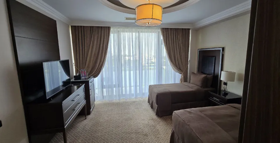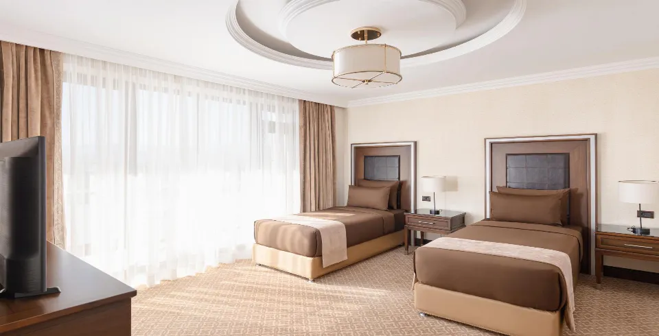 Просторный и уютный номер категории Executive Suite площадью около 81 м² разработан для полного комфорта гостей. Номер оснащен отдельной зоной для сна и отдыха, двумя односпальными кроватями и просторной жилой зоной для релаксации и работы.