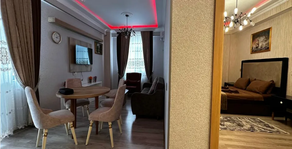 Suite номер в санатории Gold Naftalan — это светлый и элегантный номер площадью 56 м², включающий отдельную спальню и уютную гостиную. Номер прекрасно подходит для размещения до 3 взрослых и 1 ребёнка, обеспечивая комфорт и приватность.